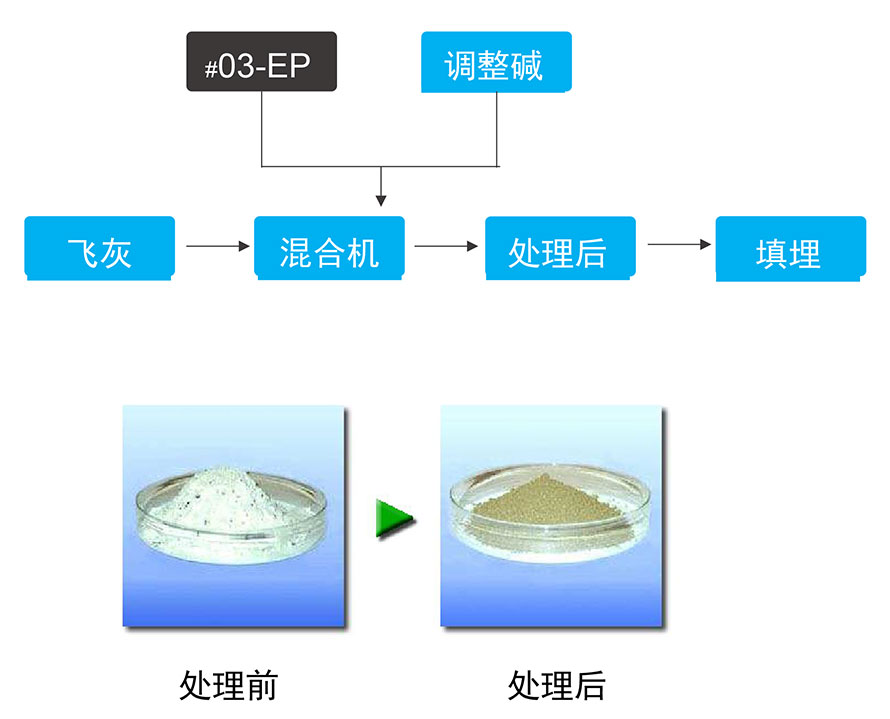 為了應(yīng)對這樣的飛灰處理,我們開發(fā)了可以作為重金屬的固定處理劑的“NEP# 03 - EP”產(chǎn)品,運用到成本較低的液體螯合法,對飛灰少量添加,可與有害重金屬(Pb、Cd、Hg等)形成牢固結(jié)合,進(jìn)行有效固定化,防止浸出。